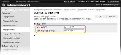 | | Le protocole SMB (Server Message Block) est un protocole permettant de partager des ressources comme des fichiers et des imprimantes entre plusieurs périphériques d'un réseau. L'appareil utilise le protocole SMB pour enregistrer les documents numérisés dans un dossier partagé. En fonction de votre réseau, vous devrez peut-être définir le nom NetBIOS et le nom du groupe de travail. |