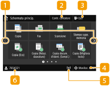 sul pannello operativo. Utilizzare questa schermata per specificare le impostazioni e per registrare le funzioni.![]() | Cambio paginaUtilizzare questo pulsante per visualizzare un'altra pagina nella schermata Schermata princip.. È anche possibile usare lo scorrimento laterale per cambiare le pagine. <Contr. contatore>Visualizza i totali per le stampe a colori e in bianco e nero separatamente. Visualizzazione del valore del contatore <Esci>Utilizzare questo pulsante per uscire dalla macchina. <Monitor. stato>Premere per verificare lo stato di stampa, per visualizzare la cronologia d'uso o le impostazioni di rete come l'indirizzo IP della macchina. Inoltre, è possibile verificare lo stato della macchina, come la quantità di carta e toner rimanenti o la presenza di eventuali errori. Schermata <Monitoraggio stato> Icona Wi-FiVisualizzata quando la macchina è collegata a una LAN wireless. Nome utente/IDViene visualizzato l'ID o il nome dell'utente connesso. |