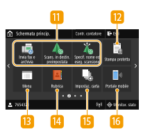![]() | <Stampa protetta>Utilizzare questa funzione per stampare un documento protetto. Stampa di un documento protetto da PIN (Stampa protetta) <Menu><Impostazioni funzione>, <Preferenze> e molte altre impostazioni della macchina iniziano con questo pulsante. Impostazione dell'elenco menu <Rubrica>Consente di registrare o modificare le destinazioni di e-mail e fax. È possibile inoltre visualizzare una destinazione registrata quando si invia un'e-mail o un fax. Registrazione delle destinazioni <Impostaz. carta>Questo pulsante viene utilizzato per specificare il formato e il tipo di carta caricata nel cassetto della carta e nel vassoio multiuso. Indicazione di formato e tipo di carta <Portale mobile>Consente di stabilire una connessione con un dispositivo mobile. Connessione a dispositivi mobili |