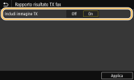 Selezionare <On> per stampare i rapporti di invio e ricezione separatamente, oppure <Off> per stampare entrambi i rapporti su un solo foglio.
