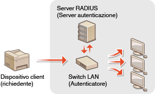 La macchina si può collegare a una rete 802.1X come dispositivo client. Una tipica rete 802.1X consiste di un server RADIUS (server di autenticazione), uno switch LAN (autenticatore) e dispositivi client con software di autenticazione (supplicant). Se un dispositivo cerca di collegarsi a una rete 802.1X, il dispositivo deve superare l'autenticazione utente per dimostrare che la connessione viene effettuata da un utente autorizzato. Le informazioni di autenticazione vengono inviate e verificate da un server RADIUS, che consente o rifiuta comunicazioni sulla rete in funzione del risultato di autenticazione. Se l'autenticazione non riesce, lo switch LAN (o il punto di accesso) blocca l'accesso dall'esterno della rete.