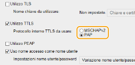 1 | Selezionare la casella di controllo [Utilizzo TTLS] o [Utilizzo PEAP]. Protocollo interno per TTLS È possibile selezionare MSCHAPv2 o PAP. |