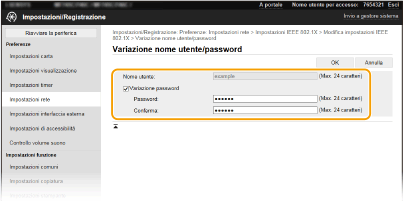 3 | Impostare nome utente e password. [Nome utente] Immettere dei caratteri alfanumerici per il nome utente. [Variazione password] Per impostare o modificare la password, selezionare la casella di controllo e immettere dei caratteri alfanumerici per la nuova password nelle caselle di testo [Password] e [Conferma]. |