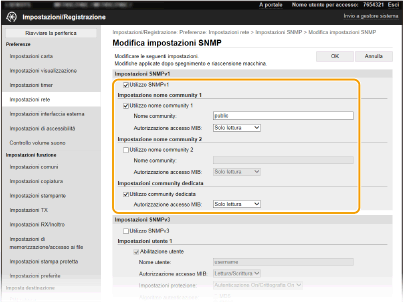 Per ciascuna community, selezionare [Lettura/Scrittura] o [Solo lettura] per privilegi di accesso a oggetti MIB.
