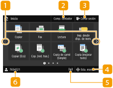 en el panel de control. Utilice esta pantalla para especificar la configuración y registrar funciones.![]() | Cambiar de páginaUtilícelo para ver otra página de la pantalla Inicio. También puede deslizar el dedo lateralmente para cambiar de página. <Comp. contador>Muestra el número total de impresiones en blanco y negro y en color por separado. Visualización del valor del contador <Cerrar sesión>Utilice este botón para cerrar la sesión en el equipo. <Esta. monitor>Púlsela para consultar el estado de impresión, para ver el historial de uso o para ver las opciones de red, como puede ser la dirección IP del equipo. Asimismo, podrá consultar el estado del equipo, como por ejemplo, la cantidad restante de papel y la cantidad de tóner restante en los cartuchos, o si se ha producido algún error. Pantalla <Monitor de estado> Icono Wi-FiAparece cuando el equipo está conectado a una LAN inalámbrica. Nombre de usuario/IDSe muestra el nombre o ID del usuario que ha iniciado sesión. |