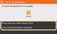 Cuando aparece un mensaje Durante la copia o la impresión, podrá continuar imprimiendo el original. Si aparece un mensaje sobre el cartucho de tóner negro cuando el equipo reciba un fax/I-fax o esté configurada la impresión automática de informes, los informes y los faxes/I-faxes recibidos se almacenarán en el equipo de forma que no aparezcan difuminados una vez impresos. Para seguir imprimiendo aunque la cantidad restante en el cartucho de tóner sea baja, establezca <Seguir imp. Si cart. bajo> en <On>. <Seguir imp. Si cart. bajo>Especifique cuándo se mostrará un mensaje Puede establecer cualquier valor como porcentaje de la cantidad restante en el cartucho de tóner que hará que aparezca este mensaje. <Mostrar tiempo preparar cart.> |