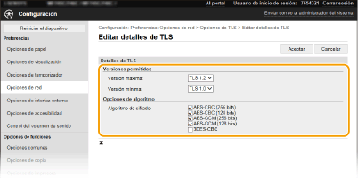 Especifique la [Versión máxima] y la [Versión mínima] de TLS.