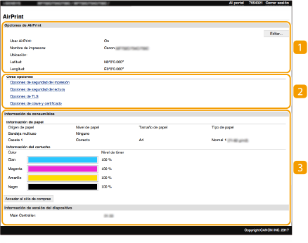 Puede visualizar la pantalla para AirPrint, en la que, además de acceder a las opciones de AirPrint, puede ver la información sobre los consumibles, como el papel y el cartucho de tóner. Además, puede configurar las opciones de las funciones de seguridad.