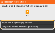 Dit bericht betekent dat de tonercartridge met de aangegeven kleur binnenkort moet worden vervangen. Zorg dat u beschikt over een nieuwe tonercartridge. Vervang de tonercartridge als u dit bericht ziet net voordat u een grote taak wilt gaan afdrukken. Dit verschijnt als <Actie bij waarschuwing> is ingesteld op <Afdrukken stoppen> (