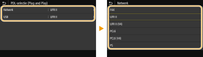 Selecteer een paginabeschrijvingstaal (PDL), zodat de machine wordt gedetecteerd als een printer die compatibel is met die taal wanneer de machine via Plug and Play wordt aangesloten op een computer.