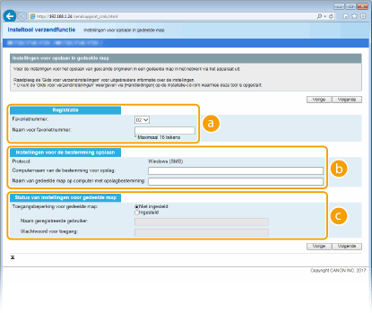 SMB configureren). Als u het apparaat wilt configureren voor het via SMB opslaan van gescande documenten in een gedeelde map in het netwerk, moet u vooraf de locatie van de gedeelde map vanaf een computer opgeven. Dit gedeelte beschrijft hoe u het Insteltool verzendfunctie gebruikt om de opslaglocatie op te geven.