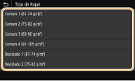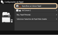 Após o registo da predefinição de papel, o ecrã de definição de papel não aparece quando o papel é colocado e é utilizada sempre a mesma definição. Se colocar um tamanho ou um tipo diferente de papel sem alterar as definições de papel, a máquina pode não imprimir corretamente. Para evitar esse problema, selecione <Especificar ao Colocar Papel> no passo 3 e depois coloque o papel.