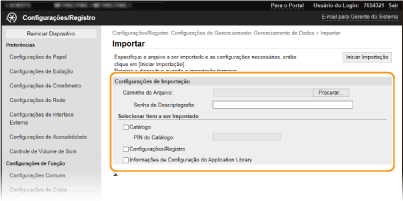 Clique em [Procurar] e selecione o ficheiro. Só é possível importar um ficheiro de informações de configuração do dispositivo (*.dcm) ou um ficheiro de Livro de Endereços da Canon (*.abk). Se selecionar o tipo de ficheiro de Livro de Endereços da Canon, não necessita de definir mais nenhum item.