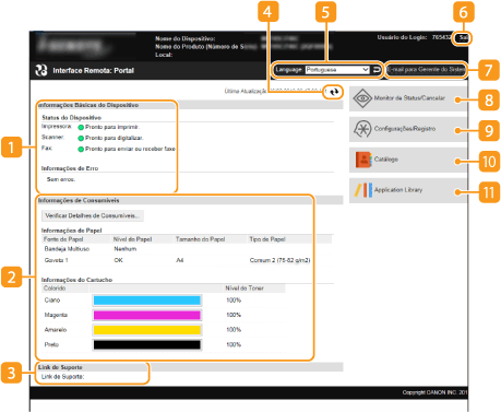 Quando inicia sessão na UI Remota, aparece a seguinte página do portal. Esta secção descreve os itens apresentados na página do portal e as operações básicas.