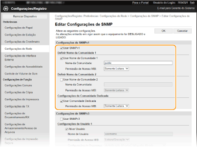 Se o SNMPv1 estiver desativado, algumas funções da máquina ficam indisponíveis (por exemplo, a obtenção de informações da máquina através do controlador de impressora).
