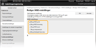2 | Rediger indstillingerne efter behov. ![]() [Brug WSD-print] Marker afkrydsningsfeltet for at udskrive via WSD. Hvis du ikke bruger WSD-udskrivning, skal du fjerne markeringen i afkrydsningsfeltet. [Brug WSD-browsing] Marker afkrydsningsfeltet for at hente oplysninger om maskinen fra en computer via WSD. Afkrydsningsfeltet markeres automatisk, når afkrydsningsfeltet [Brug WSD-print] er markeret. [Brug WSD-scan] WSD-scanning giver mulighed for at scanne dokumenter til en computer, uden at du skal installere scannerdriveren. Marker afkrydsningsfeltet for at scanne dokumenter via WSD. Hvis du ikke bruger WSD-scanning, skal du fjerne markeringen i afkrydsningsfeltet. [Brug computerscan] Marker afkrydsningsfeltet for at bruge WSD-scanning ved at betjene maskinen via kontrolpanelet. Dette afkrydsningsfelt kan kun markeres, når afkrydsningsfeltet [Brug WSD-scan] er markeret. Hvis du vil udføre en scanning, skal du vælge <Scan> på skærmen Hjem og angive en WSD-tilsluttet computer som scanningsdestination. (Scanning og lagring på en computer). [Brug Multicast Discovery] Marker afkrydsningsfeltet for at indstille maskinen til at svare på rundsendingsregistreringsmeddelelser. Hvis afkrydsningsfeltet er ryddet, forbliver maskinen i dvaletilstand, også selvom der strømmer rundsendingsregistreringsmeddelelser på netværket. |