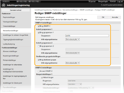 Hvis begge SNMP-versioner er aktiveret, anbefales det, at MIB-adgangstilladelse i SNMPv1 angives til [Skrivebeskyttet]. MIB-adgangstilladelsen kan indstilles uafhængigt i SNMPv1 og SNMPv3 (og for hver bruger i SNMPv3). Hvis [Læs/skriv] (fuld adgangstilladelse) vælges i SNMPv1, negerer det de robuste sikkerhedsfunktioner, der er et kendetegn ved SNMPv3, fordi de fleste af maskinindstillingerne så kan kontrolleres med SNMPv1.