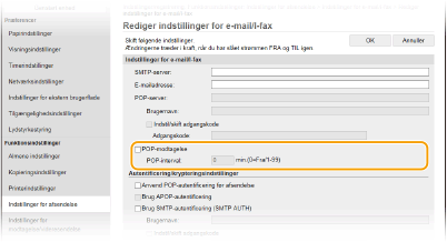 For at bruge POP3-serveren til godkendelse for autentificering før du sender e-mail eller I-faxer, skal du markere afkrydsningsfeltet.