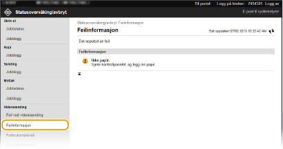 Når du har logget på i systemstyrermodus, kan du klikke på [Slett] for å slette dokumenter som ikke kunne videresendes. Når du har logget på i systemstyrermodus, kan du klikke på [Jobbnummer] for å vise detaljert informasjon om eller forhåndsvise dokumentet som ikke kunne videresendes. |