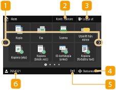 på kontrollpanelen. Använd den här skärmen för att ange inställningar för funktioner samt registrera dem.![]() | Byta sidaAnvänd denna för att visa en annan sida på skärmen Hem. Det går även att snärta med fingret sidledes för att byta sida. <Kontr. räknare>Visar totalsummor för svartvita utskrifter respektive färgutskrifter. Visa räknarvärdet <Logga ut>Använd den här knappen för att logga ut från enheten. <Statusmonitor>Tryck om du vill kontrollera utskriftsstatusen eller se användningshistoriken eller nätverksinställningarna, t.ex. enhetens IP-adress. Du kan även kontrollera enhetens status, t.ex. hur mycket papper som finns kvar, tonermängden i tonerpatronerna eller om det har förekommit något fel. Skärmen <Statusmonitor> Ikonen Wi-FiVisas när enheten är ansluten till ett trådlöst nätverk. Användarnamn/IDNamnet eller ID för användaren som är inloggad visas. |