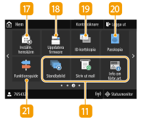 ![]() | <Inställn. hemskärm>Här kan du ändra i vilken ordning som knapparna på skärmen Hem visas. Anpassa skärmen Hem <Uppdatera firmware>Det går att uppdatera firmware via Internet. Uppdatera firmware <ID-kortskopia>Använd den här funktionen för att kopiera fram- och baksidan av körkort och andra ID-handlingar på en och samma papperssida. Kopiera ID-kort <Passkopia>Du kan kopiera flera pass på samma sida. Göra passkopior <Funktionsguide>Tryck för att visa bruksanvisning och felorsaker/lösningar. |