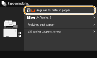 När du har registrerat standardpappersinställningar visas inställningsskärmen inte när du fyller på papper och samma inställningar används varje gång. Om du fyller på andra pappersformat eller papperstyper utan att ändra pappersinställningar blir utskrifterna kanske inte bra. För att undvika detta problem väljer du <Ange när du matar in papper> i steg 3 och fyller därefter på papper. |