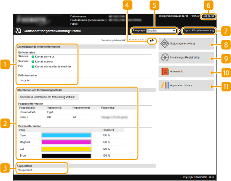 När du loggar in till fjärranvändargränssnittet öppnas följande portalsida. Det här avsnittet beskriver objekten som visas på portalsidan samt grundläggande funktioner.