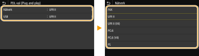 Välj ett sidbeskrivningsspråk så att enheten identifieras som en skrivare som är kompatibel med detta språk när den är ansluten till en dator med hjälp av Plug and Play.