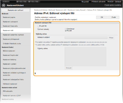 Pokud zadáte adresy IP nesprávně, může se stát, že nebude možný přístup do zařízení prostřednictvím Vzdáleného uživatelského rozhraní. V takovém případě je třeba nastavit <Filtr adres IPv4> nebo <Filtr adres IPv6> na <Vyp>.