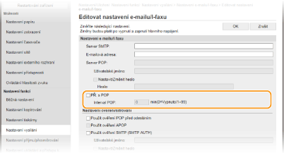 Toto políčko zaškrtněte, chcete-li používat server POP3 pro ověřování před odesláním e-mailů nebo i-faxů.