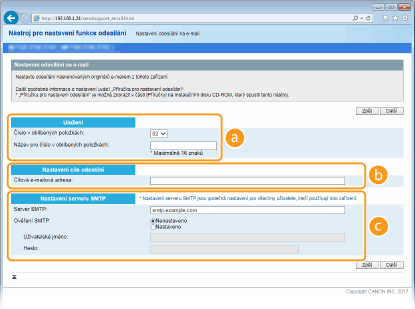 Pomocí nástroje Nástroj pro nastavení funkce odesílání lze nakonfigurovat základní nastavení pro odesílání e-mailů. Namísto nástroje Nástroj pro nastavení funkce odesílání můžete podrobnější nastavení, například nastavení ověřování POP před odesláním nebo pro šifrovanou komunikaci, nakonfigurovat pomocí Vzdáleného uživatelského rozhraní. Konfigurace nastavení komunikace pomocí e-mailů/i-faxů