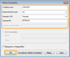 Állítsa be a kommunikációs módot és a faxszámot (vagy az URI-címet), és kattintson az [OK] gombra.