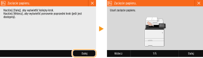 W niektórych sytuacjach po wystąpieniu błędu wyświetlone zostają wskazówki podające, jak na niego zareagować. Aby rozwiązać problem, należy postępować zgodnie z instrukcjami na ekranie. Poniżej jako przykład pokazano ekran wyświetlany w przypadku zacięcia papieru.