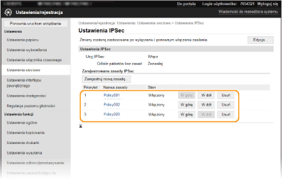 Korzystanie z panelu sterowaniaKomunikację szyfrowaną z użyciem protokołu IPSec można również włączyć albo wyłączyć z poziomu <Menu> na ekranie Główny. <Użyj IPSec>