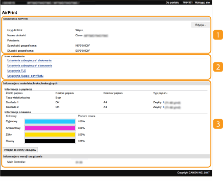 Pozwala sprawdzić wartości wprowadzone w ustawieniach AirPrint, takie jak nazwa i lokalizacja urządzenia. Przycisk [Edycja] pozwala zmienić ustawienia.