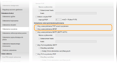 Uwierzytelnianie POP przed SMTP pozwala zapobiegać wysłaniu wiadomości e-mail i I-faksów przez nieautoryzowanych użytkowników poprzez przeprowadzenie uwierzytelniania na serwerze POP3.