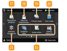 Nospiediet, lai pārbaudītu drukāšanas statusu, skatītu lietojuma vēsturi vai dažādus tīkla iestatījumus, piemēram, iekārtas IP adresi. Varat arī skatīt iekārtas statusu, piemēram, atlikušo papīra daudzumu un tonera daudzumu kasetnēs, kā arī to, vai radušās kļūdas. Ekrāns <Statusa pārraudzība>