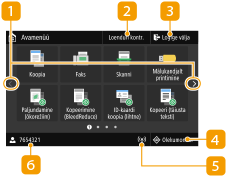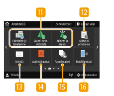 ![]() | <Kaitstud printimine>Kasutage seda funktsiooni kaitstud dokumendi printimiseks. PIN-koodiga kaitstud dokumendi printimine (Kaitstud printimine) <Menüü><Funktsiooniseaded>, <Eelistused> ja paljud muud seadme sätted käivituvad sellest nupust. Seadistusmenüü loend <Aadressirmt>Selle abil saate salvestada või muuta e-kirjade ja fakside sihtkohti. Samuti saate kuvada e-kirja või faksi saatmisel salvestatud sihtkoha. Sihtkohtade salvestamine <Paberiseaded>Seda nuppu kasutatakse paberisahtlisse ja multifunktsionaalsesse sahtlisse asetatud paberi suuruse ning tüübi määramiseks. Paberiformaadi ja -liigi määramine <Mobiiliportaal>Kasutage seda nuppu ühenduse loomiseks mobiilseadmega. Mobiilseadmega ühendamine |