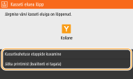 Kui faksi/i-faksi vastuvõtmise ajal või automaatse aruande väljastamise korral kuvatakse teade musta toonerikasseti kohta, salvestatakse vastuvõetud faksid/i-faksid ja aruanded mällu, et need poleks väljaprintimisel tuhmid. Printimise jätkamiseks ka siis, kui toonerikassett hakkab tühjaks saama, määrake sätte <Jätka print. tühja kassetiga> olekuks <Sees>.