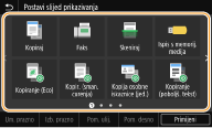 Na Početni zaslon možete dodavati gumbe prečaca za najčešće funkcije kao što su <Kopiraj>, <Faks> i <Skeniraj>. Primjerice, možete izvršavati zadatke brže i učinkovitije dodjeljivanjem slijeda postavki (npr. "Skeniranje obiju stranica izvornika, spremanje u obliku jako komprimiranih PDF datoteka i slanje e-poštom") na jedan gumb.