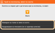 Това съобщение уведомява, че тонер касета трябва да бъде подменена скоро. Уверете се, че имате готова тонер касета за подмяна. Подменете тонер касетата, ако видите това съобщение, преди да започнете печатане на голяма задача. Това се появява, когато <Действие при предупреждение> е зададено като <Спиране на печатането> (