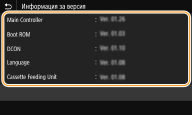 Проверка на версията на фърмуераМожете да проверите версията на фърмуера от работния панел на устройството. След като приключи операцията по актуализиране на софтуера, се уверете, че актуализацията е изпълнена успешно. Проверка на версията на фърмуера |