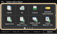 Puteţi adăuga butoane pentru comenzi rapide la ecranul Pornire pentru funcţii utilizate frecvent, cum ar fi <Copiere>, <Fax> şi <Scanare>. De exemplu, puteţi efectua activităţi mai rapid şi mai eficient prin atribuirea unei secvenţe de setări (de ex., „Scanaţi ambele părţi ale unui document original, salvaţi-l ca fişier PDF comprimat şi trimiteţi-l prin e-mail”) la un singur buton.
