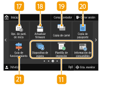![]() | <Opc. de pant. de inicio>Le permite cambiar el orden en el que se muestran los botones de la pantalla Inicio. Personalización de la pantalla Inicio <Actualizar firmware>Le permite actualizar el firmware a través de Internet. Actualización del firmware <Copia de carné>Utilice esta función para copiar el anverso y el reverso de un carné de conducir u otro tipo de tarjeta en el mismo lado de una hoja de papel. Realizar copias de carné <Copia de pasaporte>Permite copiar varios pasaportes en una hoja. Realizar copias de pasaporte <Guía de funcionamiento>Pulse para obtener ayuda sobre el funcionamiento y las causas/soluciones del error. |