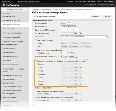 Marque la casilla de verificación de [Establecer temporizador semanal para el tiempo de apagado automático] y configure la hora en la que se apagará el equipo.