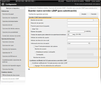 Haga clic en [Guardar nuevo servidor] para [Servidor LDAP (para búsqueda)] o [Servidor LDAP (para autenticación)].