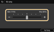 Bạn có thể thay đổi nhiều cài đặt liên quan đến màn hình, như ngôn ngữ màn hình: <Cài Đặt Hiển Thị> Bạn có thể thay đổi màn hình tự động hiển thị khi máy duy trì chế độ tĩnh trong một khoảng thời gian nhất định: <Ch.Năng Sau Khi TĐộng Đặt Lại> Bạn có thể thay đổi các cài đặt khác nhau về khả năng thực hiện của máy như độ sáng màn hình: <Khả Năng Truy Cập> |