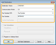 3 | Cài đặt chế độ truyền thông và số fax (hoặc URI), và nhấp vào [OK]. ![]() |