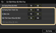 Bạn không thể chỉ định <Sử Dụng Xem Trước Fax> và <Đặt Thời Gian Khóa Bộ Nhớ> cùng một lúc. |