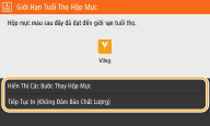 Thông báo này báo cho bạn biết rằng hộp mực cần phải được thay sớm. Hãy chắc chắn rằng bạn có sẵn một hộp mực mới. Thay hộp mực mới nếu nhìn thấy thông báo này trước khi bắt đầu in một lượng tài liệu lớn. Điều này xuất hiện khi <Thao Tác Khi Cảnh Báo> được đặt thành <Dừng In> (